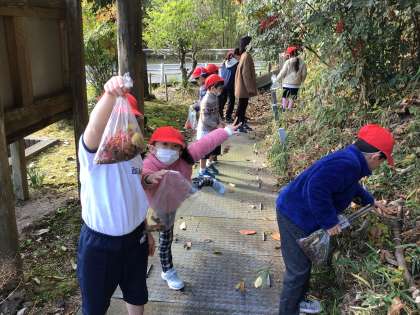 1年生が丸根山でどんぐりを拾っていました。気に入った形や大きさのどんぐりを大事に袋にしまいました。さらに、気に入った落ち葉や実も取っていました。きれいな装飾に利用できそうな収穫です。今後どのような作品になるのでしょうか。