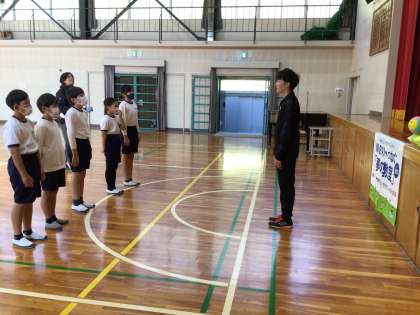 技能五輪全国大会にて金メダルを獲得された、中尾亘汰さんを講師にお招きして、5年生の「夢の教室」が開催されました。体育館で軽く運動ゲームを楽しみながら交流が始まりました。