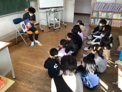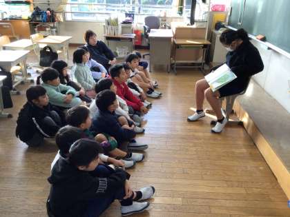 今日は図書委員による絵本の読み聞かせの日です。図書委員が準備した本を持って、担当の教室に向かいました。