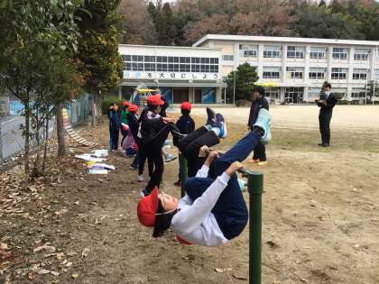 3年生の体育では、基本の技ができた児童の試演を参考にしたり、補助具を活用したりしながら技の完成を目指していました。