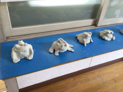 1・2年生の廊下の展示物に造形作品が並んでいます。1年生はカエル、2年生は茶碗や湯呑みなどの食器です。来週11日(月)に昨年に続き陶芸家の石黒さんを講師にお招きして、陶芸体験教室を計画しています。本番では陶土を使いますが、粘土を使って練習をしているところです。どんな作品に仕上がるのか、楽しみです。