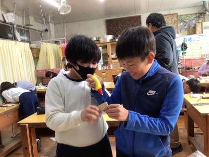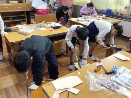 図工室から作業の音が聞こえてきましたので中を見たところ、4年生が楽しそうに活動していました。木製の枠を自分のデザインで型作り、白いシートを貼り付けていました。ノコギリを使って木材を切る姿からは逞しさを感じました。どのようなホワイトボードになるか、楽しみです。