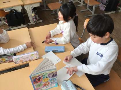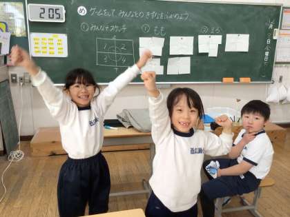 ゲームを通して絆を深めるレクリエーションを楽しんでいました。班で制作した図を審判が判定すると、大喜びの1年生でした。