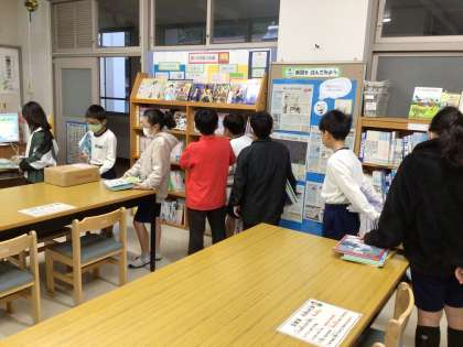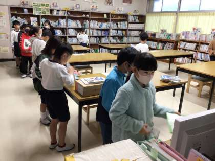 図書室に入る4年生を見掛けましたので様子を見ていると、図書室のパソコンを使って返却作業を始めました。何をしているのか尋ねると、くすのき学習で利用した川や水、水棲生物に関する本を返却しているところだと教えてくれました。本のラベルを見て、返却する棚に向かい、テキパキと図書を整える姿は、高学年の落ち着きを感じます。