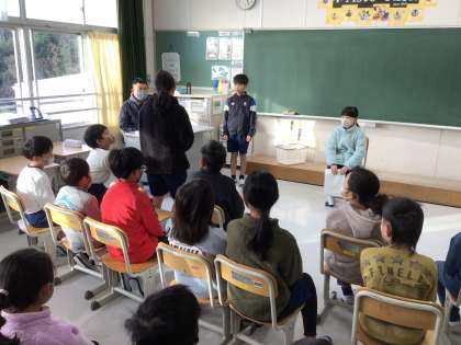 今朝は学年部スピーチが行われていました。まず、中学年の教室を参観しました。サイエンスクラブでのスライム作りについて発表があると、材料の情報や色の工夫について関心が高く、会話がつながっていきました。