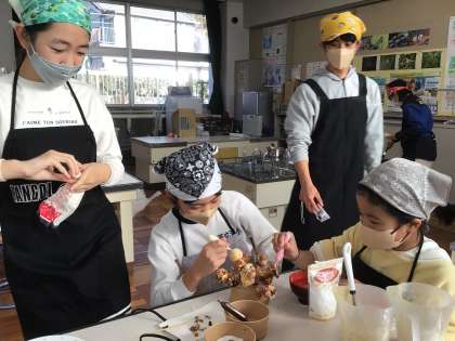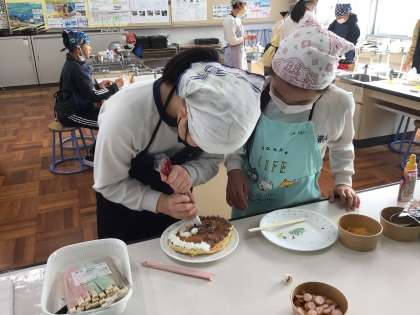 パンケーキが出来上がってきました。1階廊下はおいしそうなにおいが充満しています。パティシエのように腕を振るう児童もいます。担任持参のタコ焼き器で作ったパンケーキは、不思議な造形になっています。