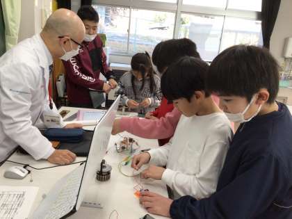 デンソーサイエンススクールを実施しています。電磁石の性質を利用した実験器具を使い、磁石と電気の関係を学んでいます。丸根山整備ボランティアでお世話になっている方も、今日は講師として授業を行なってくださいます。