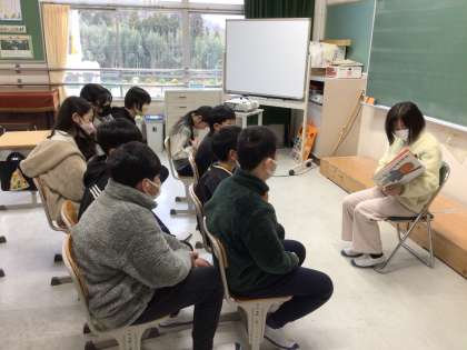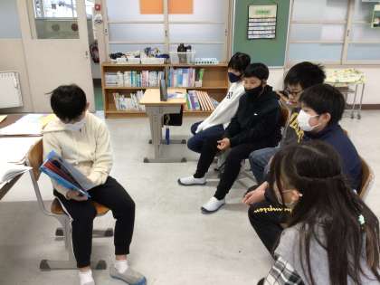 各学年の興味に応じた絵本を委員は選んでいます。1年生には恐竜の絵本を読んでいました。また季節に応じた選び方もしており、6年生は鬼のサラリーマンが主役の絵本でした。