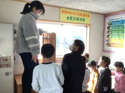 4・5・6年生が1・2・3年生に管理している施設の使い方や追究中のくすのき学習を伝えました。4年生は3年生に教えながらミニ水族館内の水槽を掃除しました。6年生は1年生に水質汚濁調査のやり方を教えました。1年生は清流の塔に入ることをとても楽しみにしていたそうです。活動の様子を学校運営協議委員の皆さんに参観していただきました。