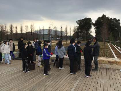 丸根山で育ったどんぐりの苗を新博物館の庭に、学校を代表して6年生が植えに行きました。新博物館は工事中の為、美術館の駐車場から歩いて植樹場所に向かいました。新博物館の外観は、すっかり完成しているように見えました。
