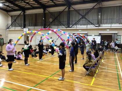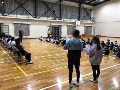 体育館で6年生を送る会の練習をしていました。5年生が司会を務め、1年生から順番に会当日の役割を確認して行きました。4年生が担当するアーチも立派に出来上がりました。6年生役を担当した児童は、緊張して座っていました。