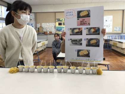 3年生の招待を受け、家庭科室に向かうと、そこは発表会場、試食会場となっていました。3年生が発案した3つのレシピの説明を受け、期待が高まり、いよいよ試食の時です。お茶や紅茶が添えられ、準備の所作も大変丁寧でした。どの料理も美味しく、とても豊かな時間でした。3年生の皆さん、ありがとう。