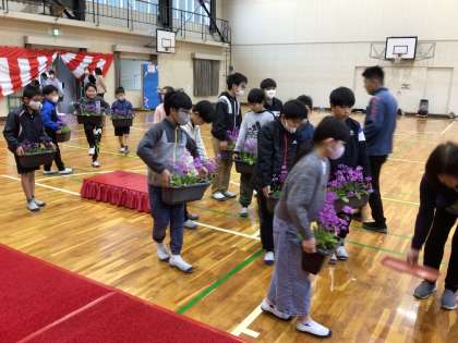 新5・6年生が登校して、明日の準備に取り組んでいます。会場の体育館を掃除して花を飾ったり、新1年生の教室の飾り付けを行っています。元気よく楽しそうに取り組む姿を見ていると、こちらがエネルギーをもらっている気持ちがします。