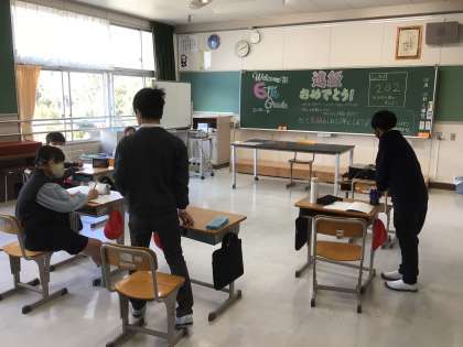 2年生以上の児童が登校しました。玄関前で楽しそうに話していました。春休み中の生活を話す児童もいました。教室に入ると早速、教科書類を確認し、式の準備をする姿が見られました。