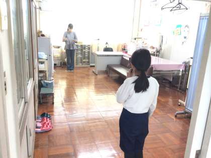 保健室では身体測定が行われていました。今日は中学年の測定です。身長と体重、視力が測られています。静かに順番を待っていました。