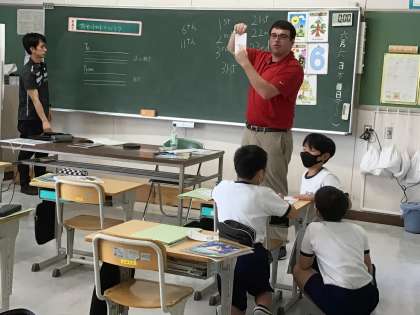 ALTカイル先生から、プレゼントカードの書き方を教えてもらい、グループでカードを作っています。最初の1字は大文字で、次は小文字で、友達にアルファベットを聞いて書いています。Fromには自分と相手、どちらを書くのかな、疑問はカイル先生に聞いて確かめています。