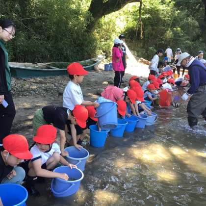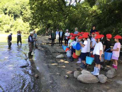 矢作川漁業協同組合中和支部、県水産課の支援を受けた活動です。放流する15センチ前後の稚魚がどのように育ったのか、今後どのように育つのか、丁寧にお話をしてくださいました。透成こども園年長児と協力して、7,000匹もの稚魚を矢作川に放流しました。