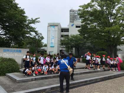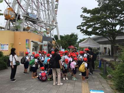 予定より早く到着しました。トイレ休憩をし、班ごとに集合写真を撮っています。今回は、卒業アルバムの制作を毎年担当している稲垣写真館さんに撮影を依頼しています。
