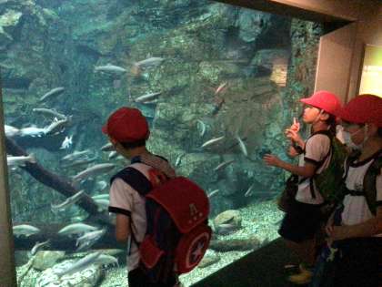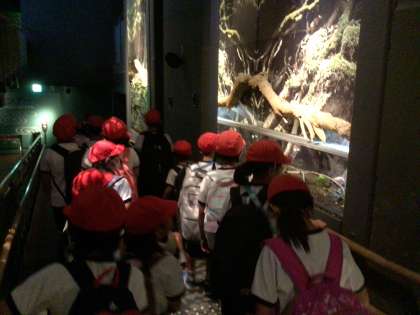 館内に入ると4階から順路がスタートします。長良川の上流に棲む生物を観察しました。学校ビオトープに棲む生物も見られました。ビオトープを訪れても、隠れていて見られませんが、水族館では水槽で観察することができました。