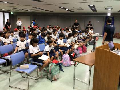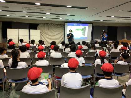 アクア・トトぎふ職員さんによる講義の時間です。川の汚れと外来種に関してお話してくださいました。家庭排水の話は、自然に学ぶ会での6年生の実験につながる内容でした。コーヒーや天ぷら油を川に流したら、生物が棲めるようになるには何リットルの水で薄める必要があるかをデータを使って解説してくださいました。