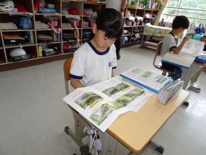 4年生は総合的な学習の時間クスノキタイムで飯野川の研究をしています。5月25日の自然にふれあう会では保護者と一緒に飯野川の水性生物調査と清掃を行いました。今日は、卒業生で共働本部コーディネーターの清水有樹さんに、4年生が伺いたいことがあり、講師として来校していただきました。清水さんは、高学年の頃の飯野川の写真を提示し、当時の環境や小学生の活動を説明してくださいました。今日のお話をきっかけに、4年生の活動は、より広がり、深まるでしょう。