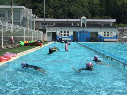 1年生がプールにいました。今日は最後のプール利用日で、レクリエーションの時間だそうです。水鉄砲で遊んだり、ボートに乗って水遊びを楽しみました。水に顔をつけたり蹴伸びの練習をしている子もいました。