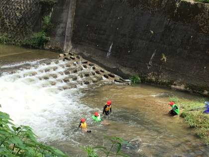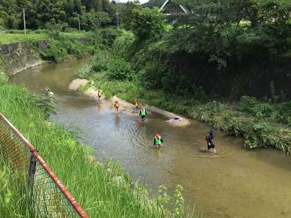 昨日計画していましたが、増水により1日延期していました。川の水は若干濁っていますが、魚を何匹か捕獲できたようです。ミニ水族館の仲間が増えます。網に入ったゴミも集めていました。後半は川遊びタイムです。