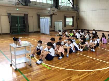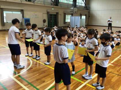通学整備に協力してくださった方々、ありがとうございました。本日、無事9月の学校生活をスタートすることができました。全校朝の会では、校長の話として、地震や台風などの災害に関しての対策を改めて話しました。今週、避難訓練も実施する計画です。また、まもなく完成予定の遊具についてお話ししました。保健委員会からの誕生日カード紹介や、身体測定も行いました。台風の影響か、多少蒸し暑いですが、児童は元気に参加しています。