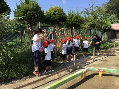 1年生が生活科で育てていた、ポップコーン用トウモロコシを収穫しに畑に行きました。遊具新設工事の柵の中に畑はありますので、工事監督さんにお願いして、収穫に向かいました。夏休み中の雨の日が少なかった為か収穫量は少なめでしたが、1年生の児童は自ら実をもいで収穫する体験ができました。