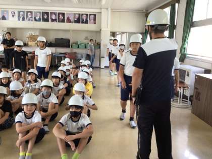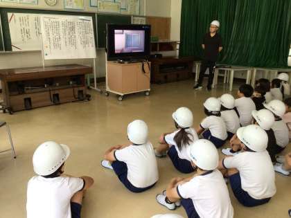 洪水・土砂崩れを想定した避難訓練を行いました。訓練放送が流れると、児童は静かに整然と避難場所である2階の音楽室に集まりました。浸水擬似体験映像を全校で見て、洪水時の様々な避難情報が、どのように配信されるのかを知りました。校長講話では、気象情報と避難情報の種類を伝えて、最寄りの避難場所を確認しました。今回は学校生活中の避難訓練でした。児童が家庭で過ごしている時はどのように行動するか、考えるようにと宿題にしました。