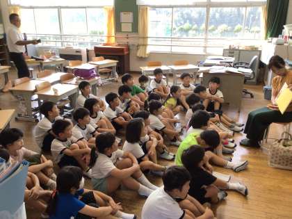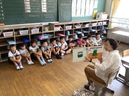 今日はボランティアグループ「ほたるの会」の皆さんによる絵本の読み聞かせの日です。登校した児童はランドセルから用具を机に移し、読み聞かせの場所に移動して待っていました。夏休みが明けて初めての会ですが、子どもたちの準備は4月に比べて、ずいぶん早く出来るようになりました。