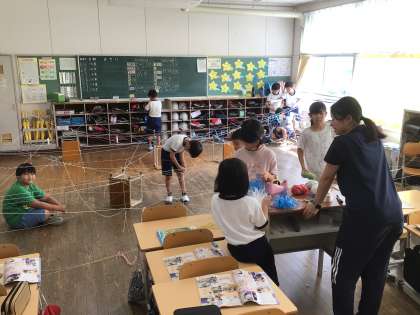 3年生児童からの招待を受けて3年生教室に向かうと、そこは不思議な空間に作り変えられていました。図工の授業で、ひもをつないで、創意工夫して新たな場所を協力工夫して作り出す授業でした。創作を続ける児童もいれば、作られた空間を楽しむ児童もいました。普段の3年生教室とは全く違う印象で、児童は皆、楽しく活動していました。