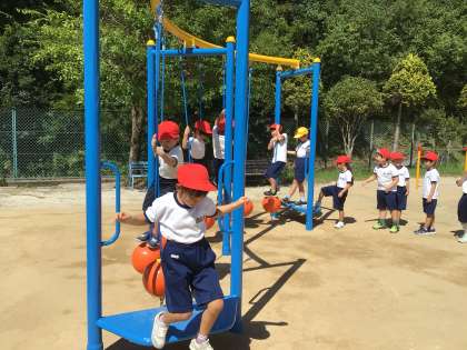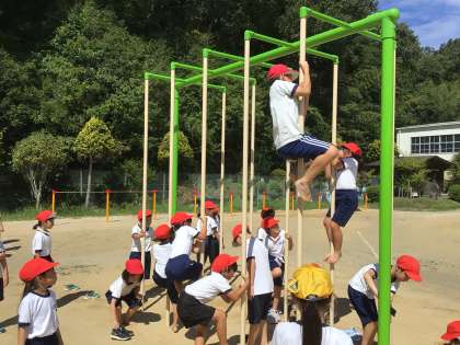 運動場に新設された遊具で子どもたちは遊び始めました。鉄棒、綱渡り、登り棒、雲梯、ジャングルジム、平均台の6種類を次々に体験しました。遊び始めると、登り棒の頂上まで辿り着くことが難しく、子どもたちは何度も挑戦していました。