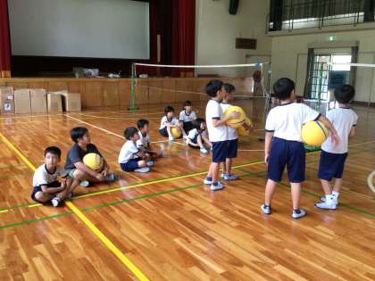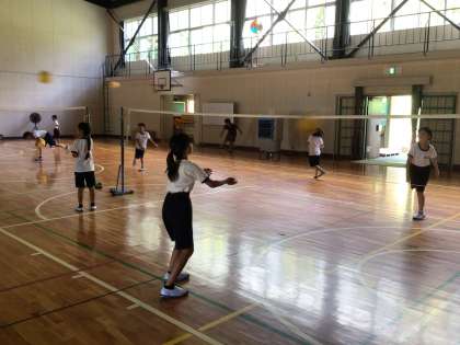 体育館で3年生が体育の授業を行っています。支柱を立ててネットを張る作業を自分たちで担当して、どんどん練習を進めていました。サーブの練習、スパイクの練習と続き、段々とバレーボールらしい動きになってきました。