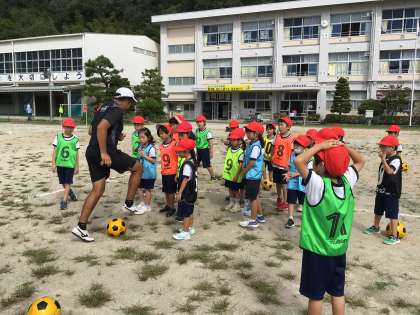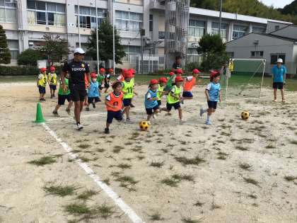 名古屋グランパスから2名のコーチが来校し、1・2年生対象のボールクリニックを実施しています。ボールを活用した準備運動やボールをバトンとして使うリレーなど、児童は楽しく参加しています。今週から気温が下がりましたので、運動場でのびのびと活動することができています。