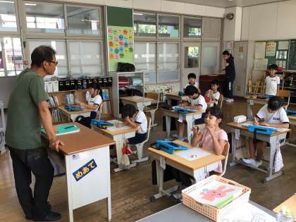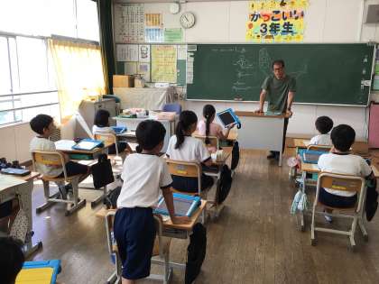 3年生はビオトープの生物を調べています。研究すると様々な疑問が生まれます。今日はビオトープアドバイザーの古田さんを教室にお招きして、質問に答えていただきました。カエルの種類ごとの卵の数やビオトープの食物連鎖、トンボの種類が減っていることなど、児童の質問に答えながらビオトープの生物について解説してくださいました。