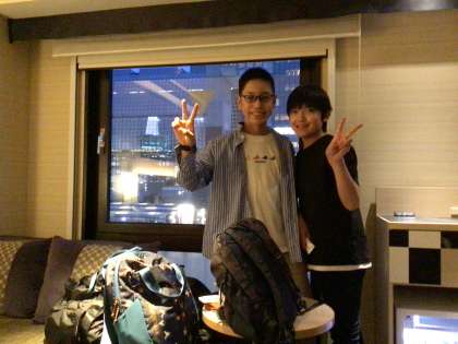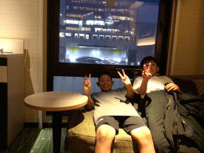 チェックインし各部屋に入りました。用具を整え、夕食までの時間を室内で休憩しています。南側のカーテンを開けると、京都駅が綺麗に見えていて、児童はうっとり見ています。