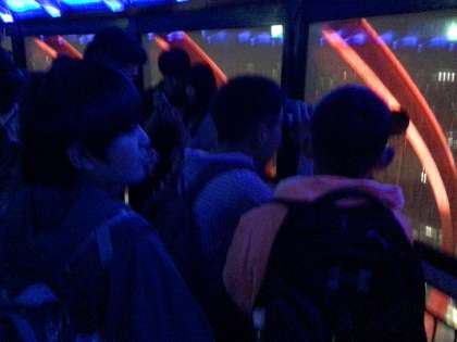 京都タワー展望室に来ています。スポットライトを浴びて夜でも見られる名所を望遠鏡を覗いて探しています。