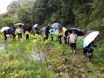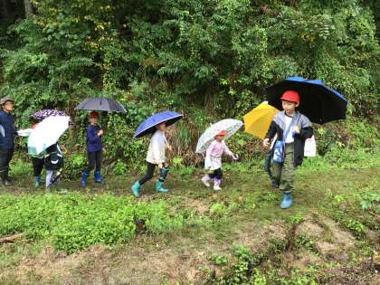 3年生は先週、ビオトープアドバイザーの古田さんに、ビオトープに棲息する生物についてたくさんの質問をしました。古田さんに教えていただいたことを、1年生を案内しながらビオトープで確認して回りました。天気は小雨で、足元に気をつけながら散策しています。