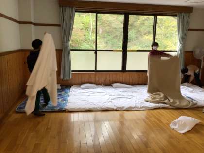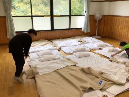 各部屋で協力して寝具を整えています。配置に各班の個性が現れているようです。