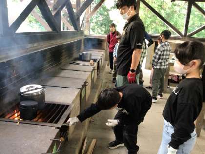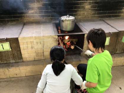 全ての班が火を起こせました。かまどに火を移して、カレーと飯盒を温め始めました。薪から出る煙の多さに子どもたちは驚いています。