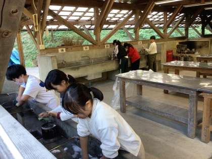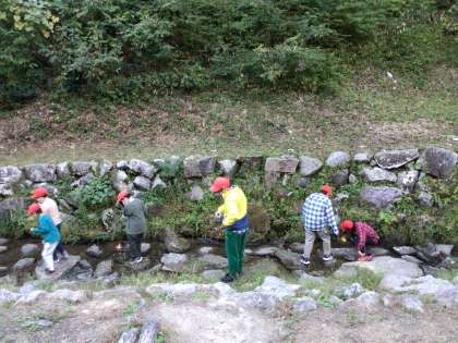 片付けを協力して終えて、生み出した時間は休憩時間になりました。宿泊棟でゆっくり過ごす児童もいれば、小川で生き物を探す児童もいます。六所山周辺は、少しずつ暗くなってきました。