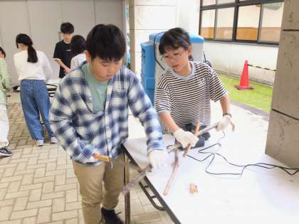 木の枝を使ったスプーン作りに挑戦しています。木の枝は六所山周辺で拾った枝を使います。思い出のスプーンは、どのような形になるでしょうか。