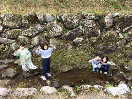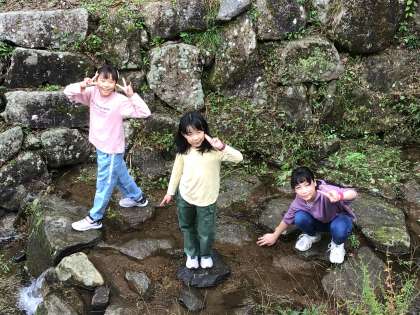 クラフト製作が完成した児童は、製作場所前の小川を散策することにしました。小さな魚やサワガニがいます。