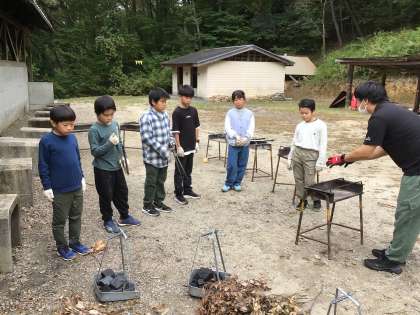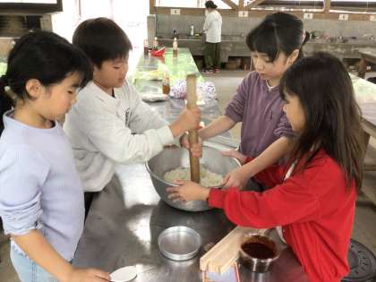 ファミリー広場に移動して五平餅づくりに挑戦しています。午前中は雨の予報でしたが、ほぼ降らず、順調に活動しています。