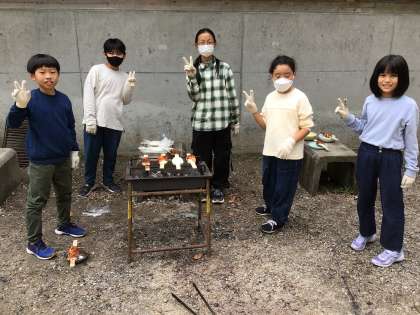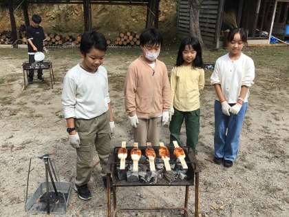 板に米を貼り付け五平餅の形に整えました。炭でじっくり炙っています。