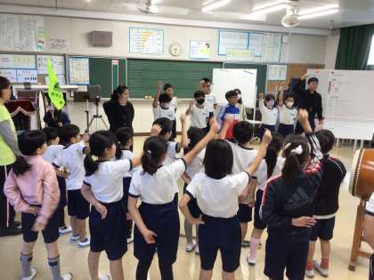 朝の会後に、紅組は体育館、白組は音楽室に集まり練習をしています。それぞれの高学年が手本を見せながら、応援の流れを説明しています。