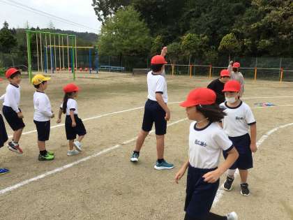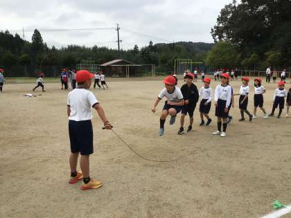 今日は縦割り班の長縄跳びをしています。高学年が縄を回します。各班の跳んだ回数は玄関奥の掲示に記録していきます。