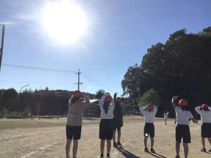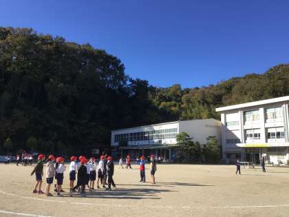 WRCのイベントで飛来するブルーインパルスを一目見ようと、長縄跳びをやりながら、畑の手入れをしながら、飛行を見ようと、運動場に児童が集まってきました。丸根山上空を2度飛んで行きました。しばらくは活動を続けながら参観するようです。