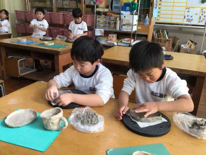 陶芸家の石黒さんが今年も陶芸の授業に来てくださいました。1年生が器づくりに挑戦しています。粘土で練習した見本を見ながら、お皿やコップを作っています。1月18日のくすのき学習学芸発表会に披露する計画です。